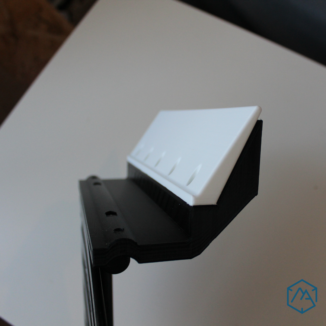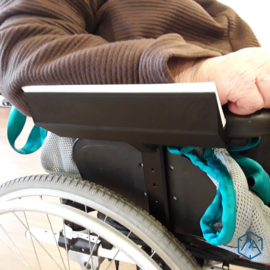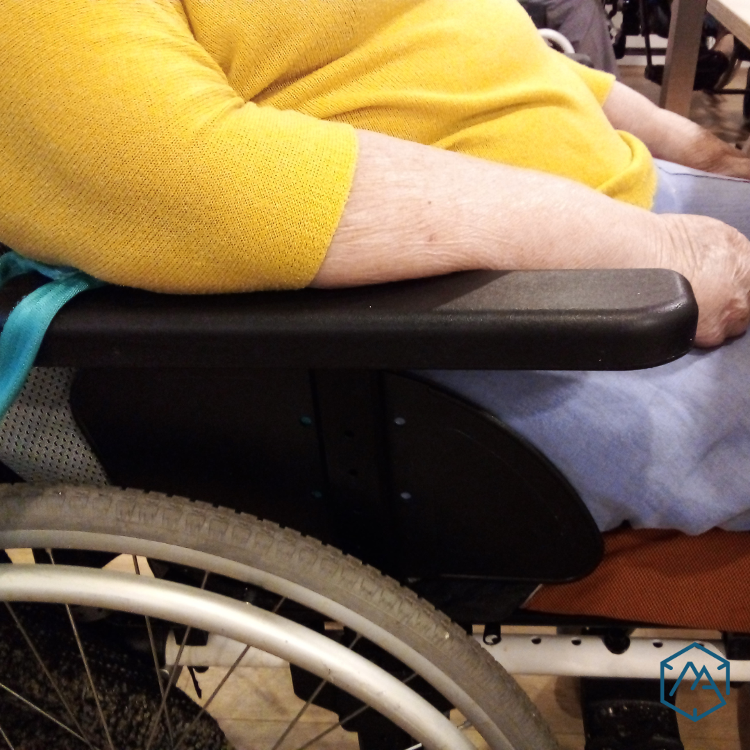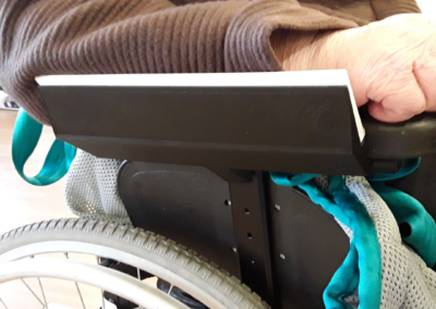 Ce cale-coude pour fauteuil roulant standard à été réalisé dans le but d’éviter à un bras avec peu de mobilité à tomber à l’extérieur de l’accoudoir.